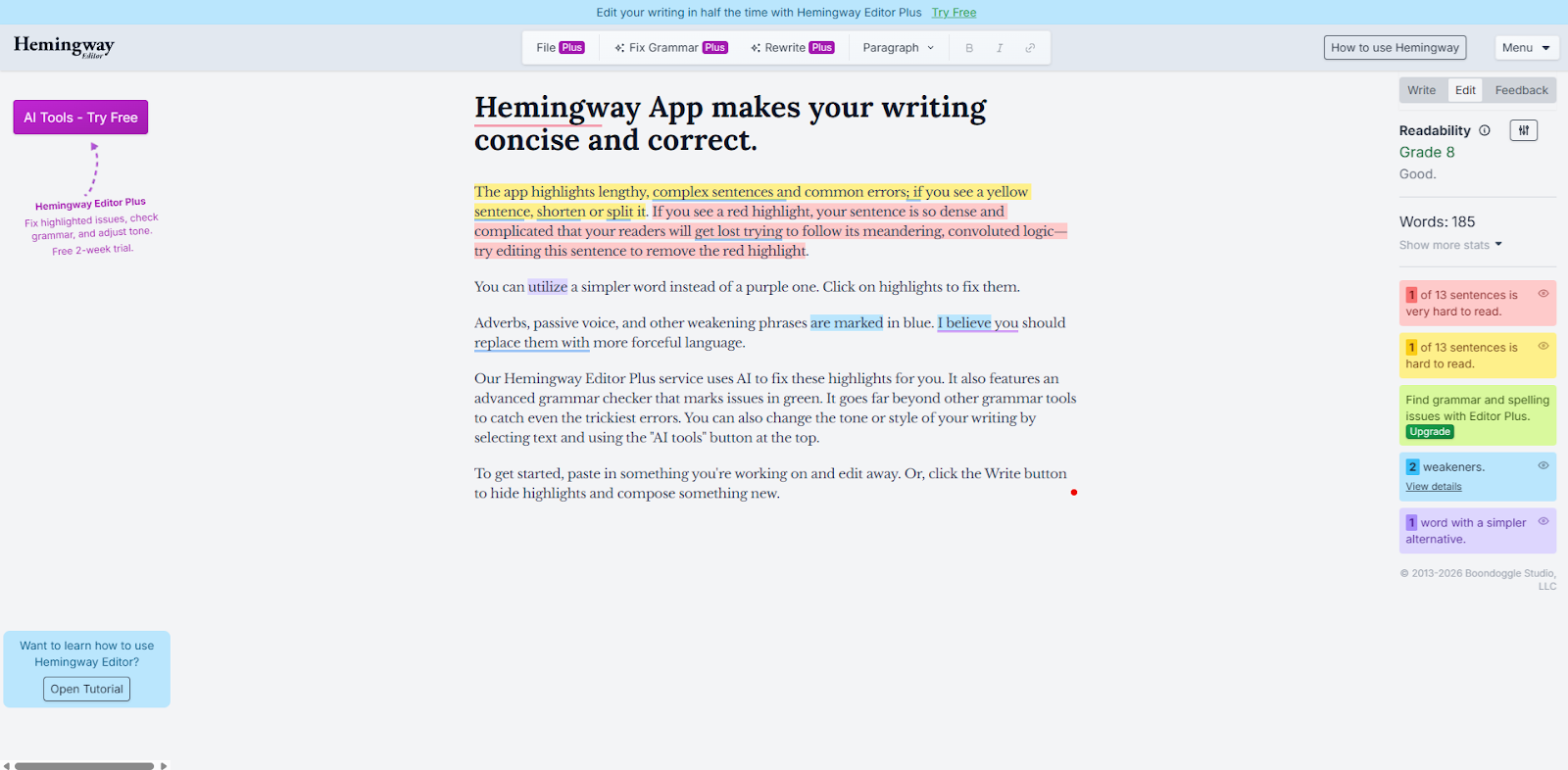 Hemingway helps you simplify. If you publish lots of content (especially social threads and landing pages), clarity wins. Run drafts through it to catch overly complex sentences and tighten your writing.