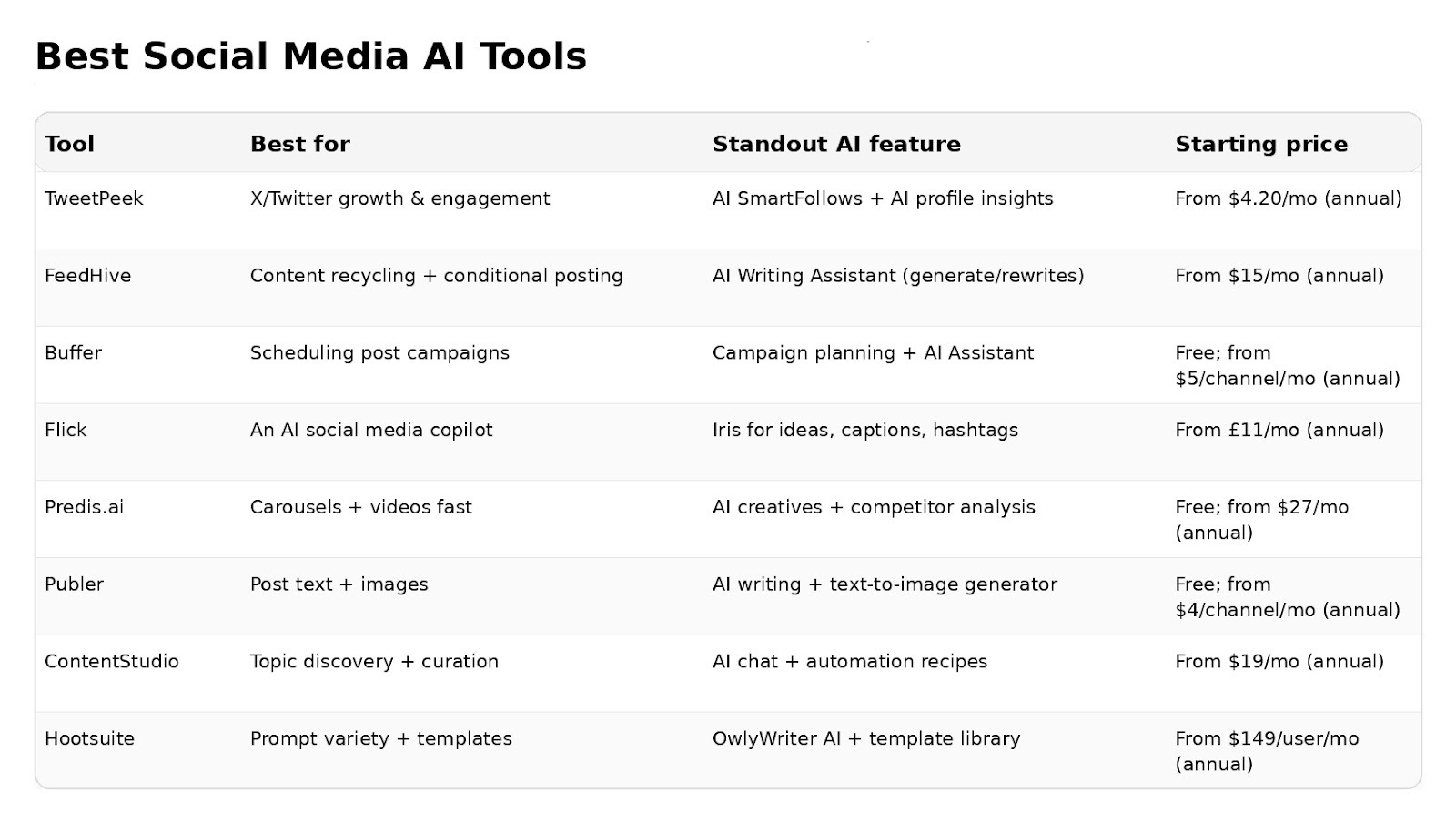 - If you need multi-platform scheduling + AI rewrites, look at Buffer.